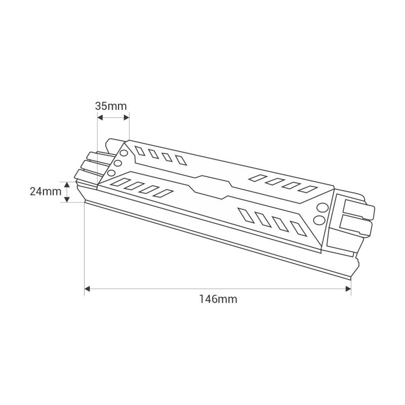 Son format compact (146 x 35 x 24 mm) permet une intégration discrète dans les faux plafonds, meubles techniques ou coffrets électriques.