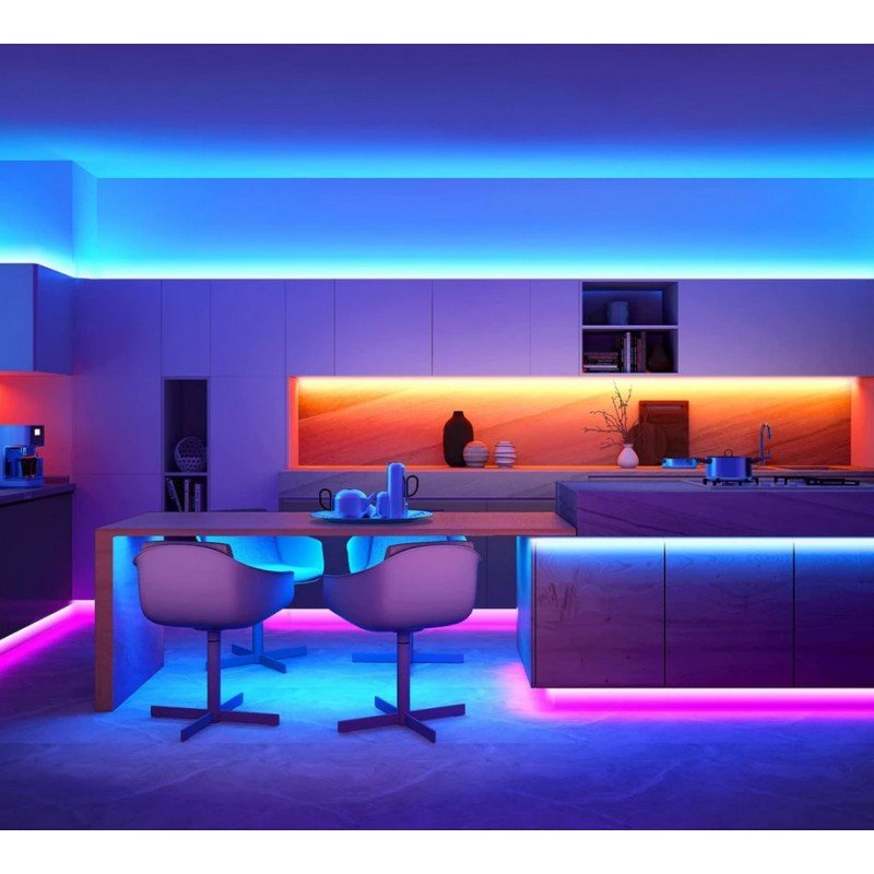 Kit ruban LED RGB musical WiFi prêt à l’emploi pour créer une ambiance spectaculaire en quelques minutes. Ce bandeau LED de 5 mètres réagit à la musique : les couleurs et effets changent au rythme des sons pour dynamiser vos soirées, un gaming room ou une chambre. Le kit inclut alimentation 24V, contrôleur musical WiFi et télécommande 24 touches pour ajuster couleur, luminosité, scénarios et vitesse. Grâce à l’application Tuya (iOS/Android), pilotez votre éclairage depuis votre smartphone, où que vous soyez. Compatible Amazon Alexa et Google Home, il se commande aussi à la voix (allumer/éteindre, varier l’intensité, changer de couleur). Installation facile avec adhésif 3M. Usage intérieur IP20.